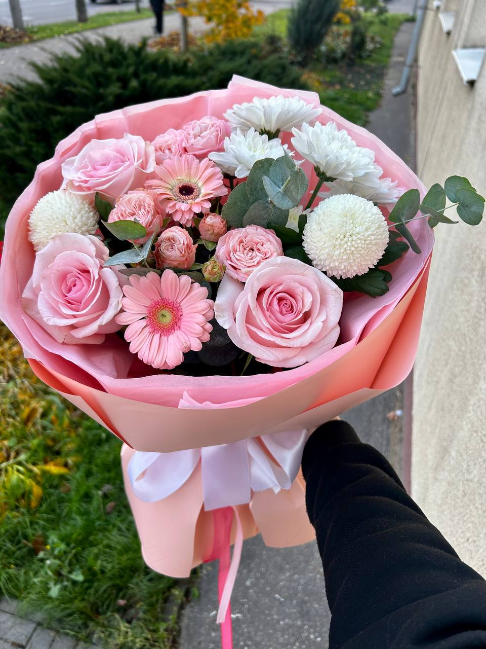 | состав | гербера, пионовидная роза, роза, хризантема, эвкалипт |