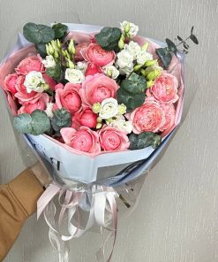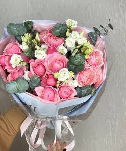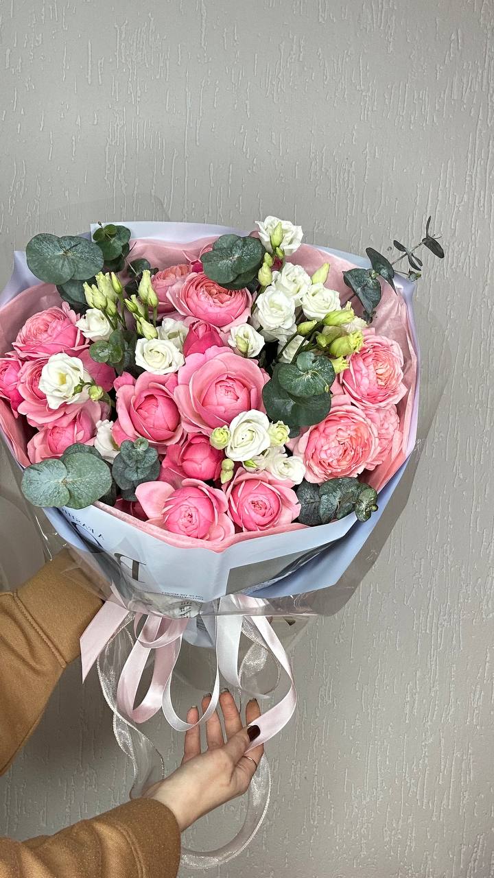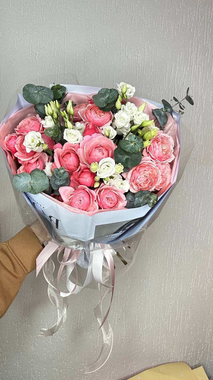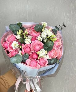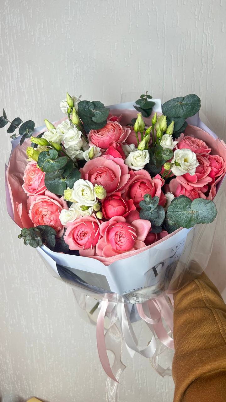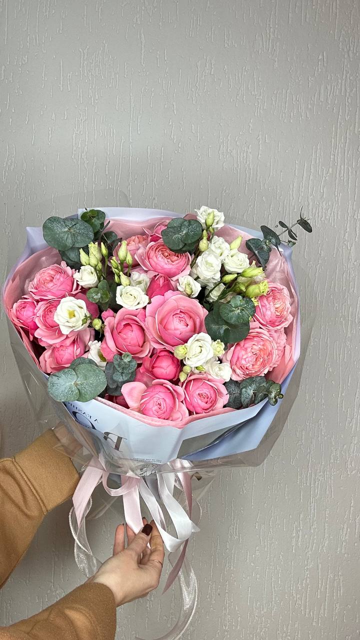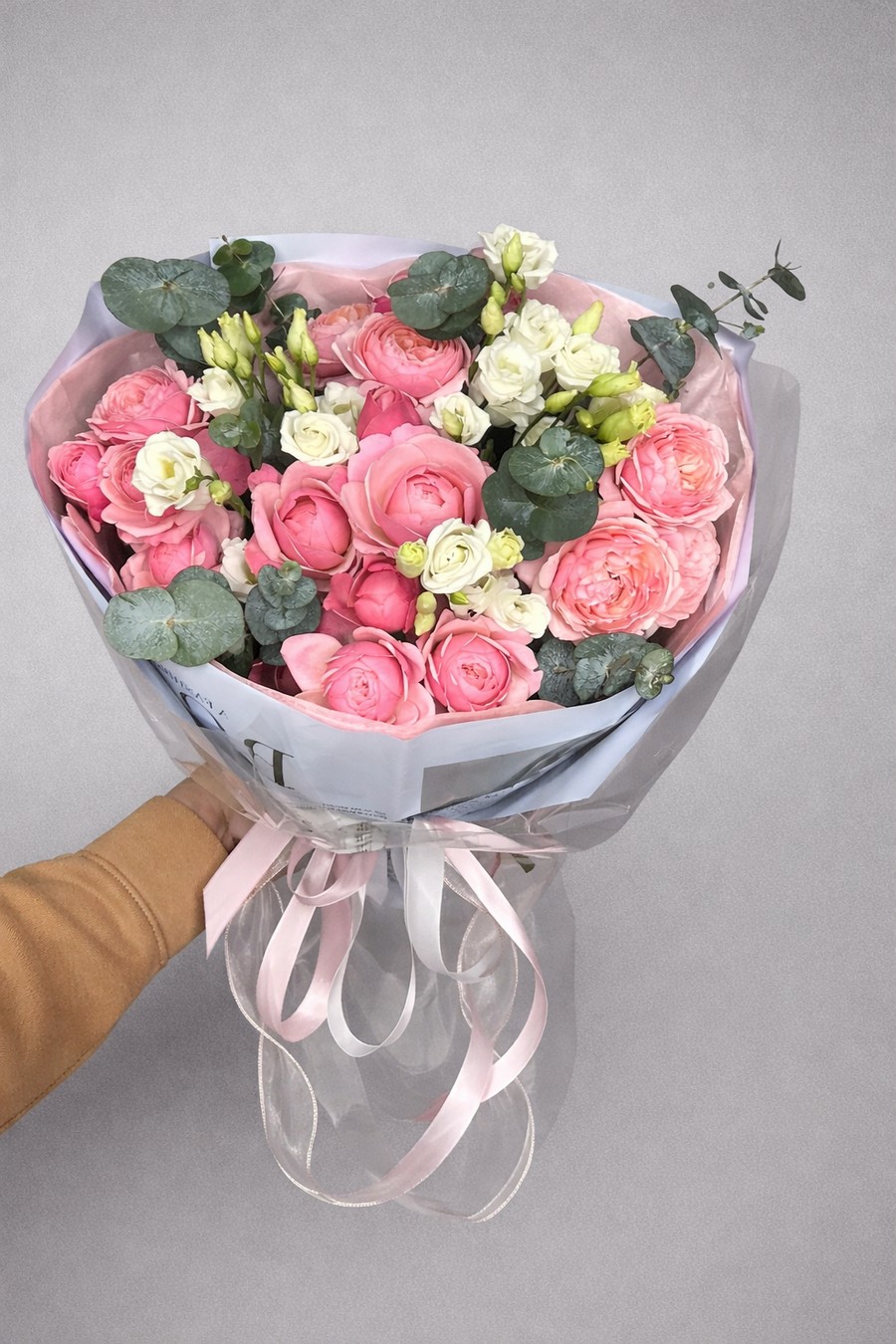 Состав: 5шт эустомы, 5шт кустовой Розы пионовидной, 2шт эвкалипта, упаковка, лента
