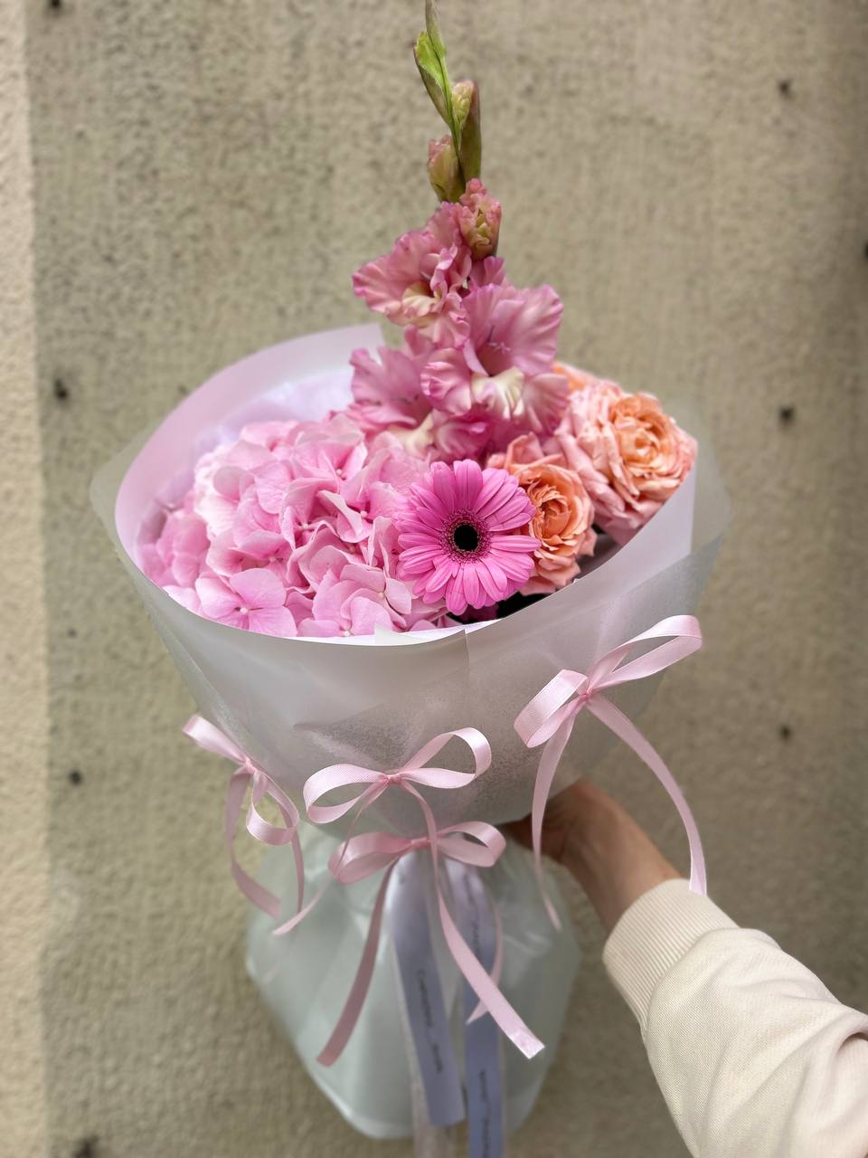 Состав: 1 гортензия, 1 гербера, 1 пионовидная Роза, 1 гладиолус , упаковка, лента