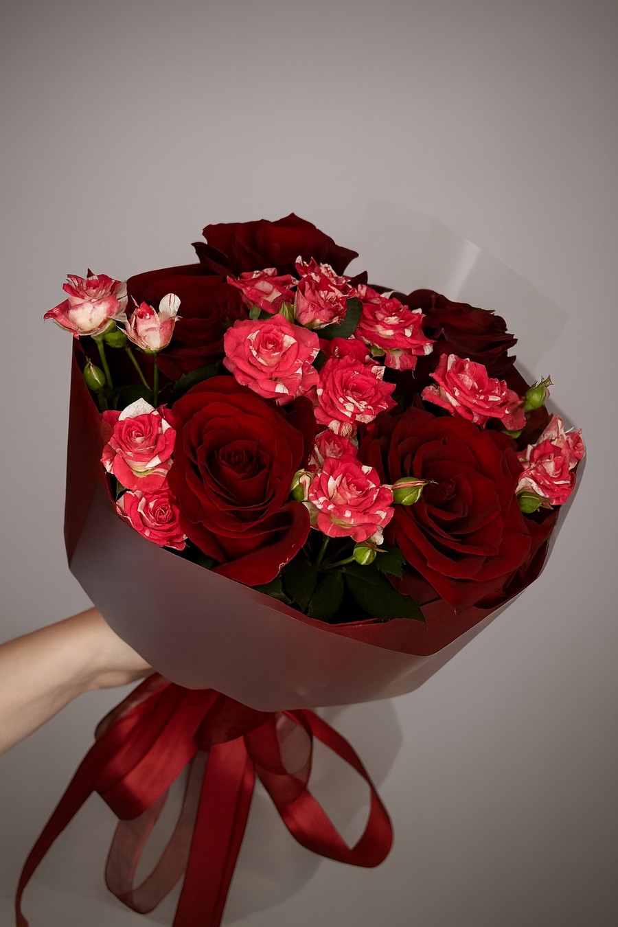 Состав: 5 роз штучных, 3 кустовых розы, упаковка, лента