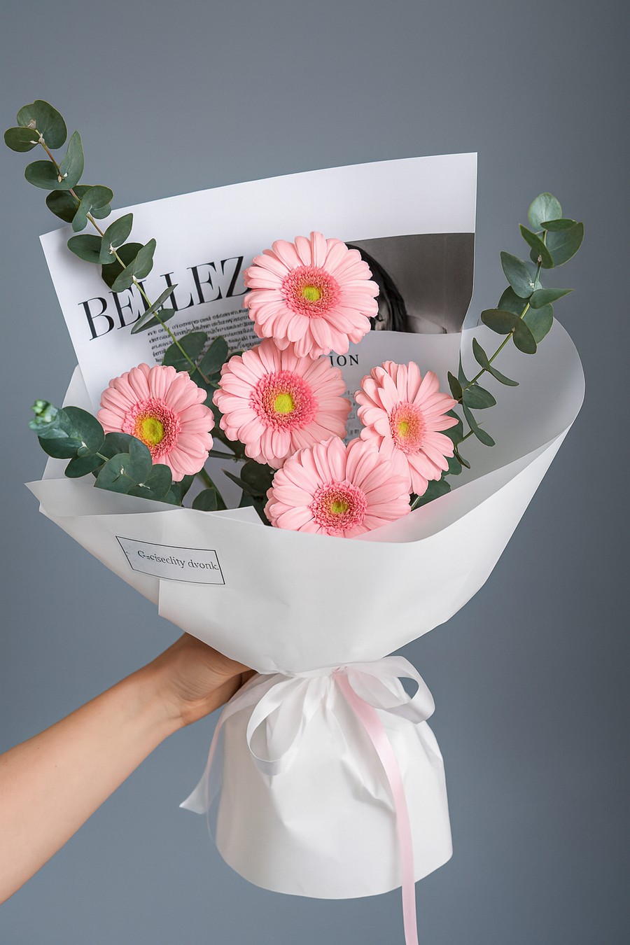 Состав: 5 Гербер, 2 эвкалипта, лента, упаковка