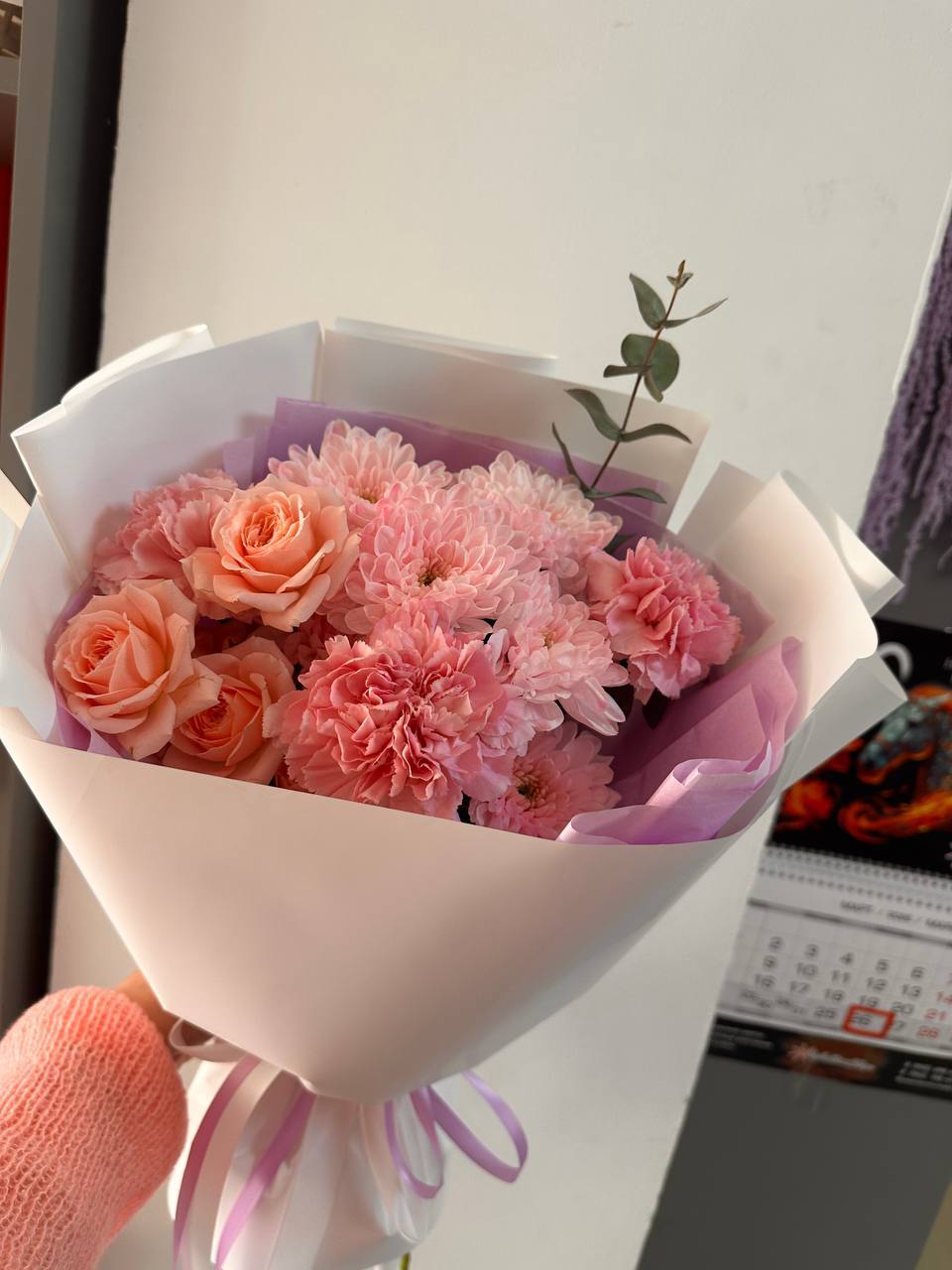 Состав: 3 диантуса, 1 хризантема, 1 кустовая Роза, 1 эвкалипт, упаковка, лента