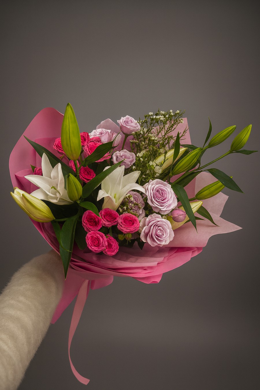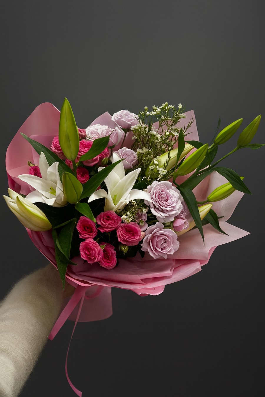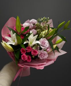 Состав: 2 лилии, 4 кустовых розы, 1 Хамилациум, лента, упаковка
