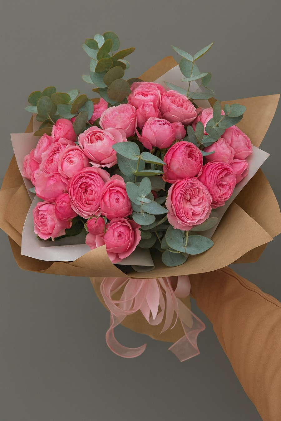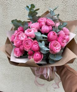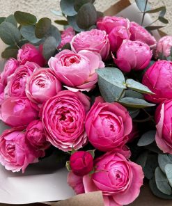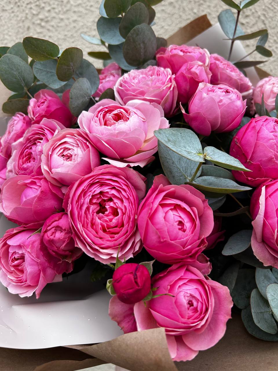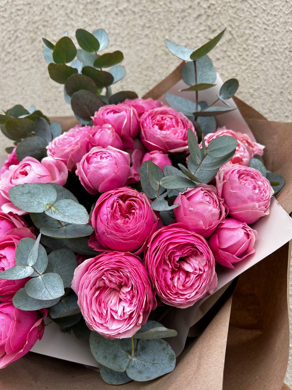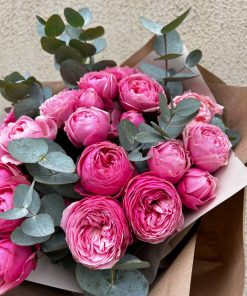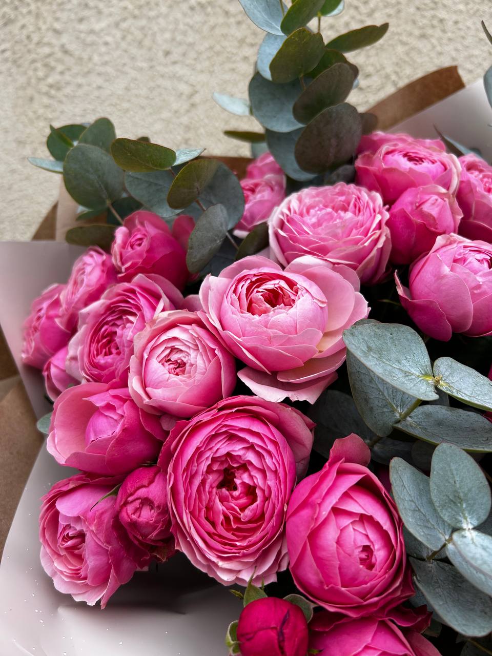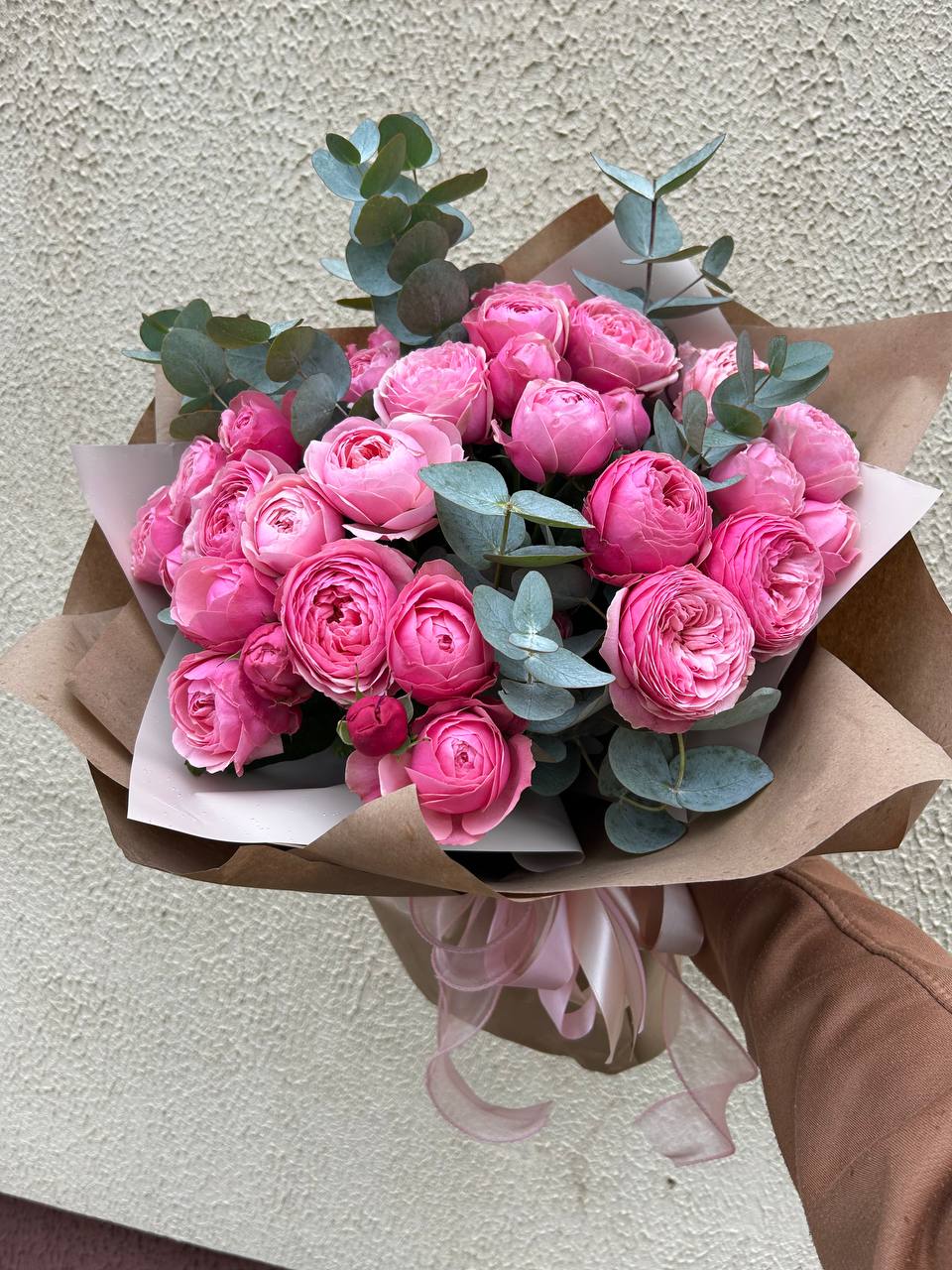 Состав: 11 пионовидных кустовых роз, 2 эвкалипта, упаковка, лента