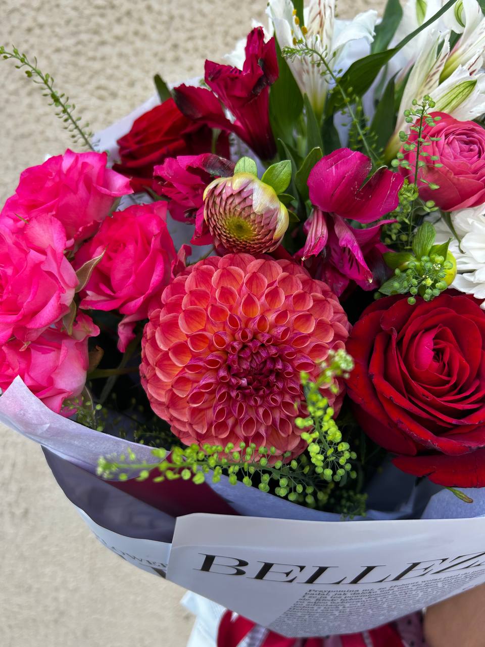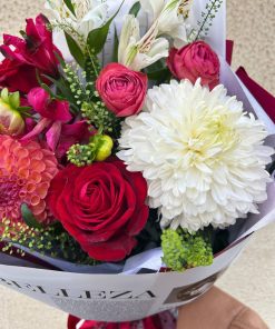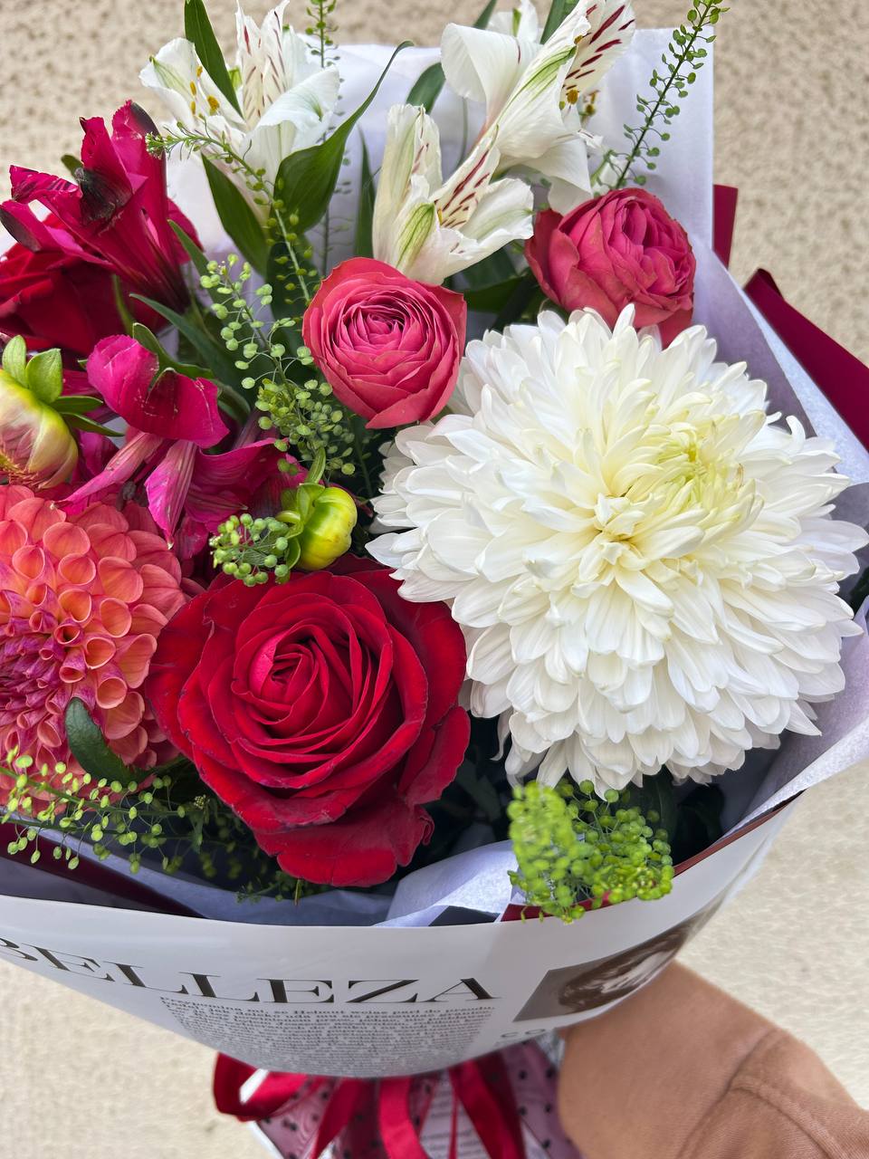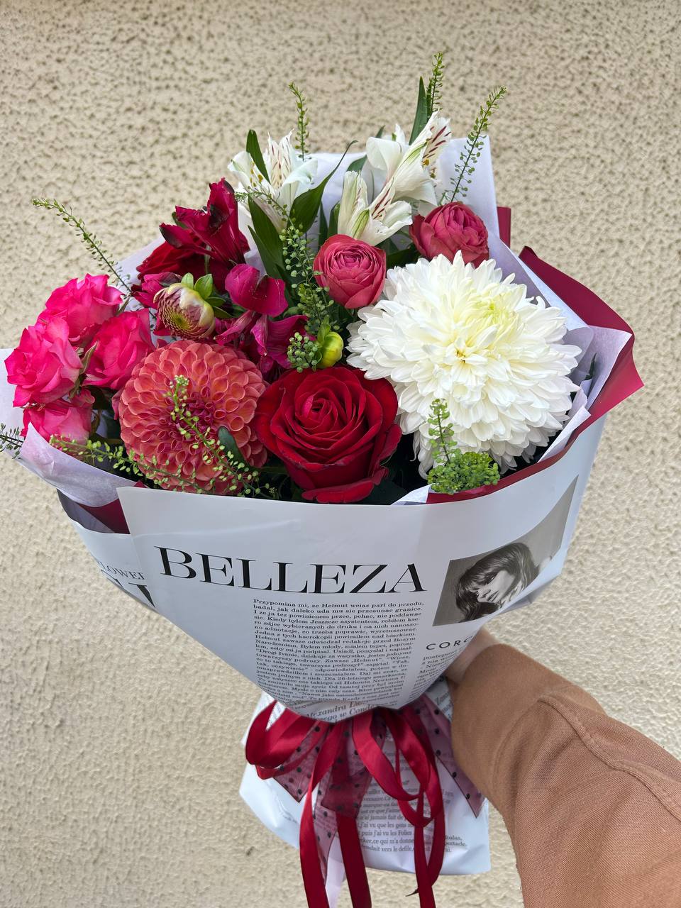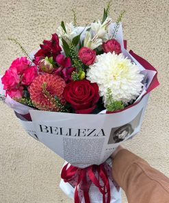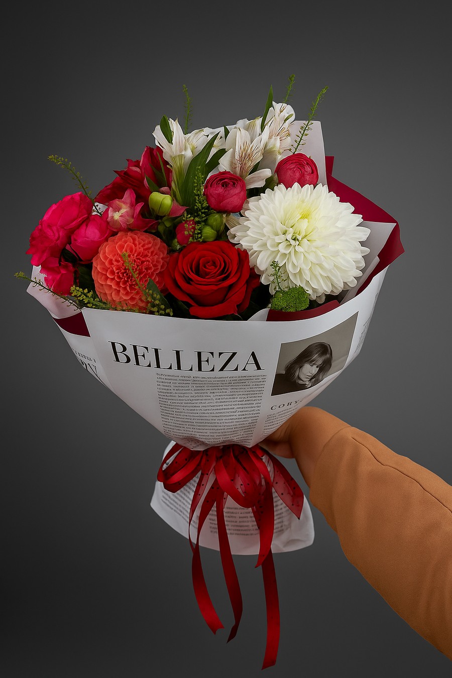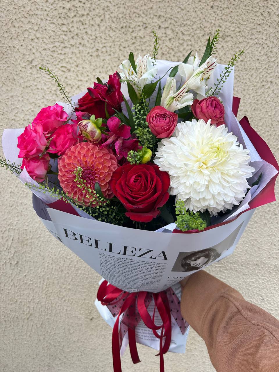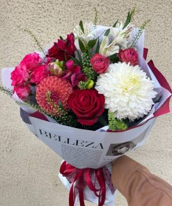 | состав | альстромерия, кустовая роза, роза, тласпи, хризантема |