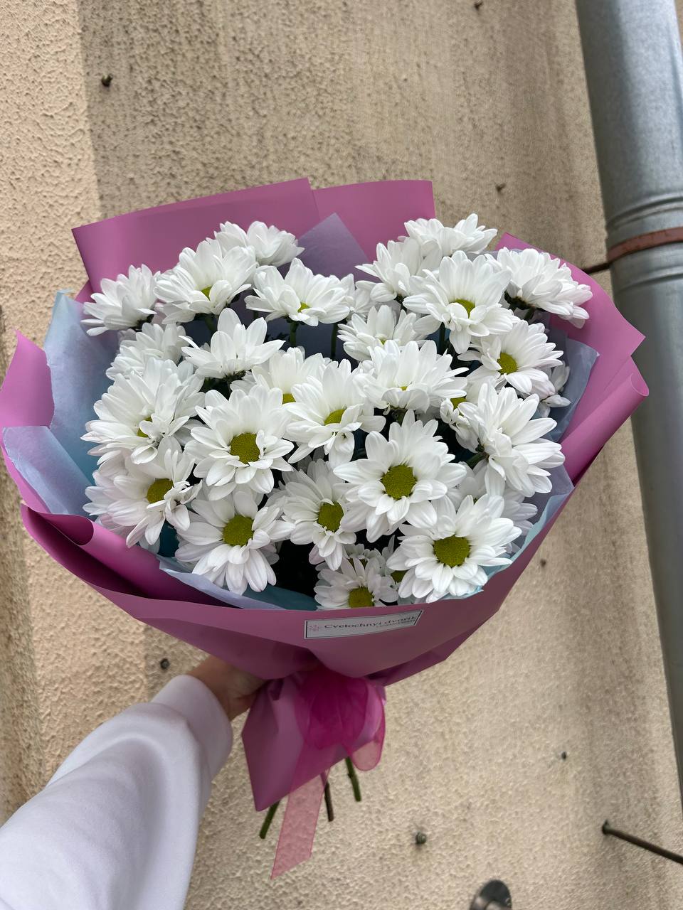 Состав: 5 хризантем ромашковых, упаковка, лента