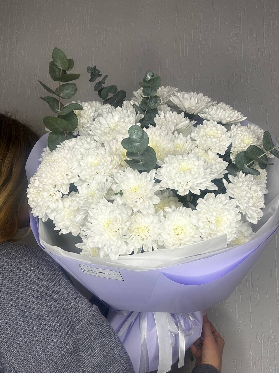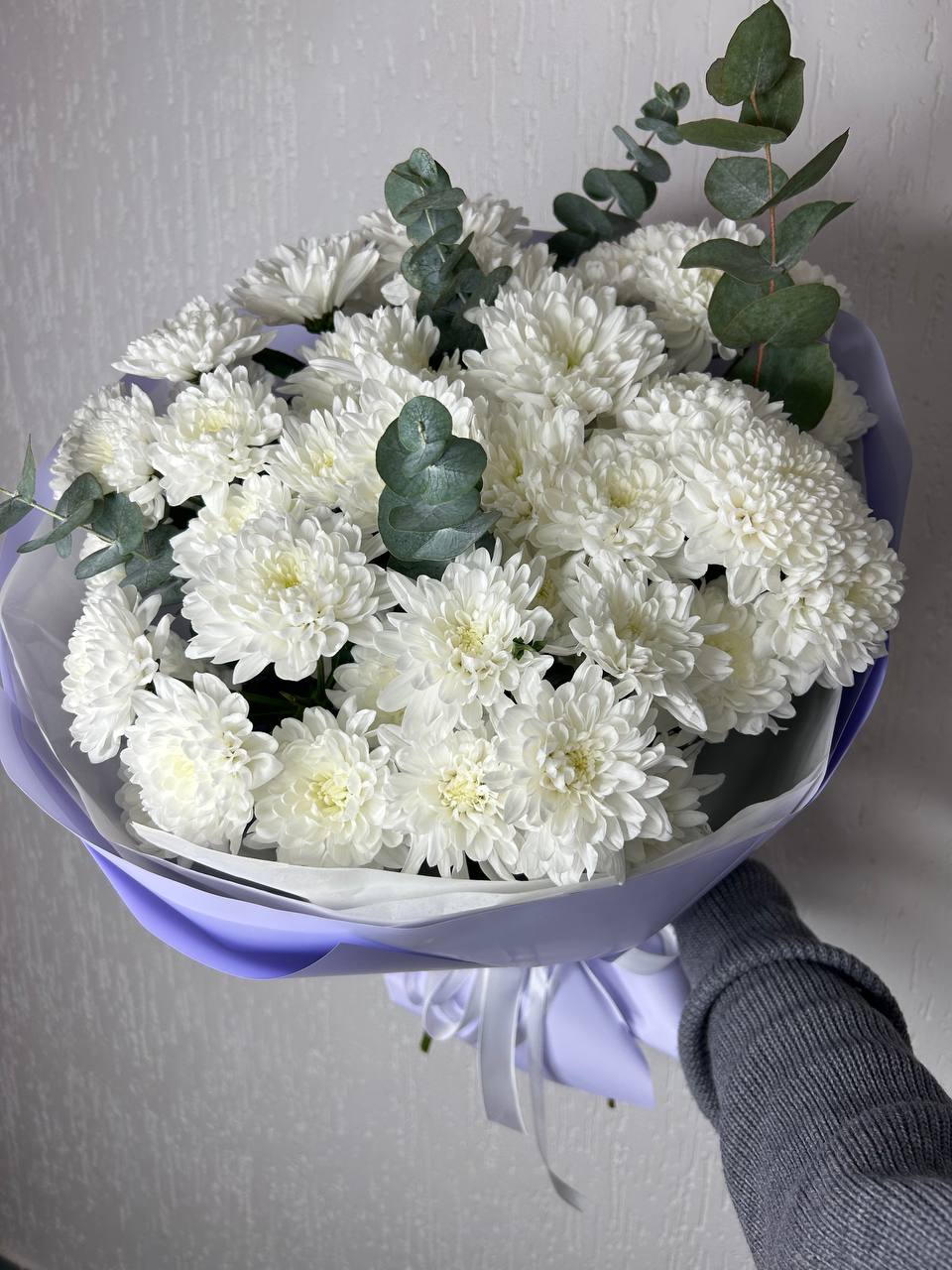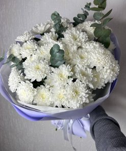 Состав: 7 хризантем кустовых, 2 эвкалипта, упаковка, лента