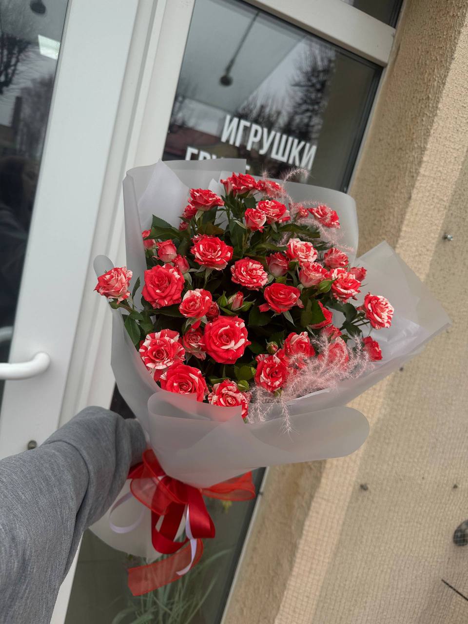 Состав: 5 кустовых роз, 2 декора, упаковка, лента