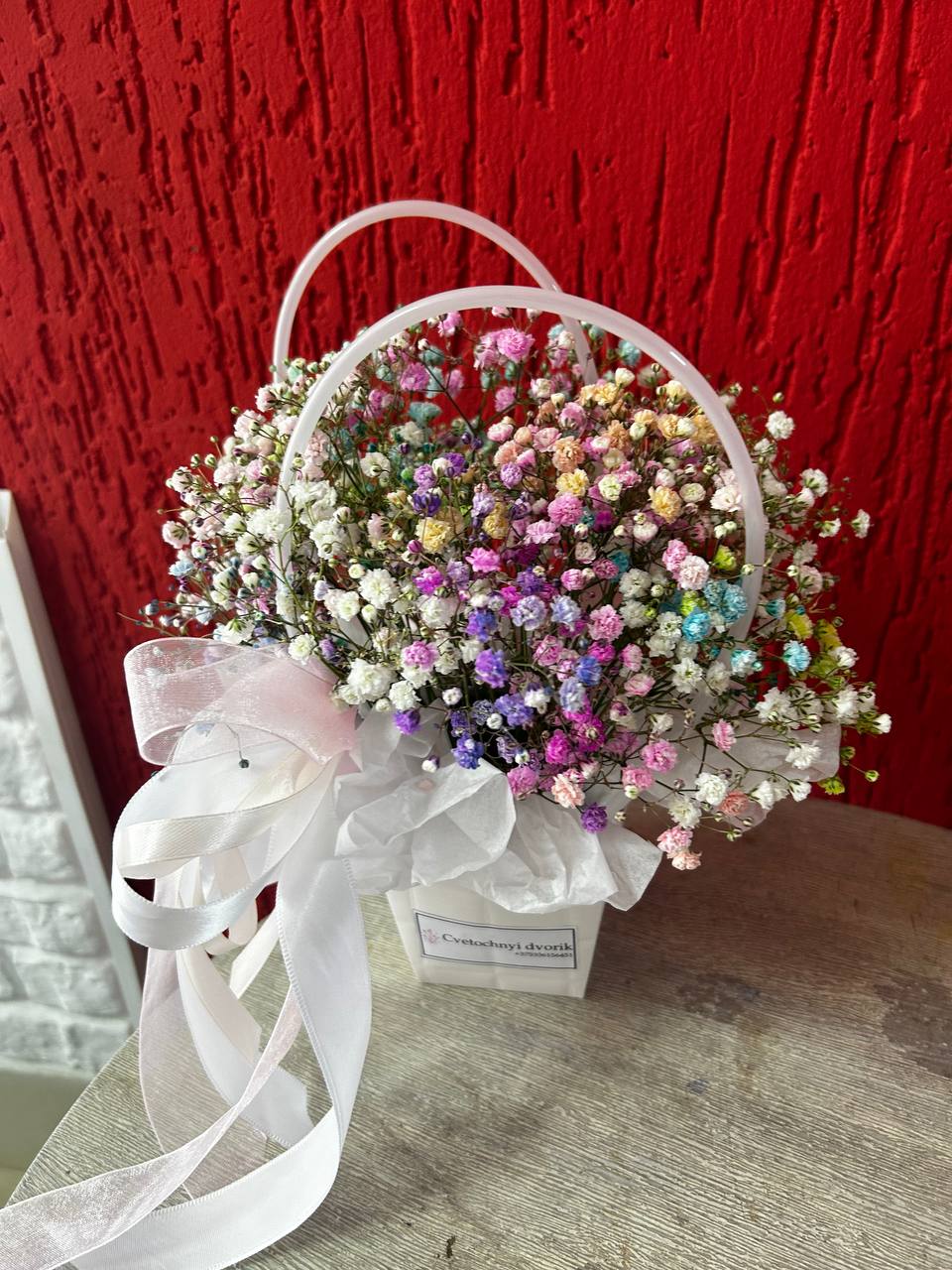 Состав: 3 гипсофилы, сумочка, Флористическая губка, лента