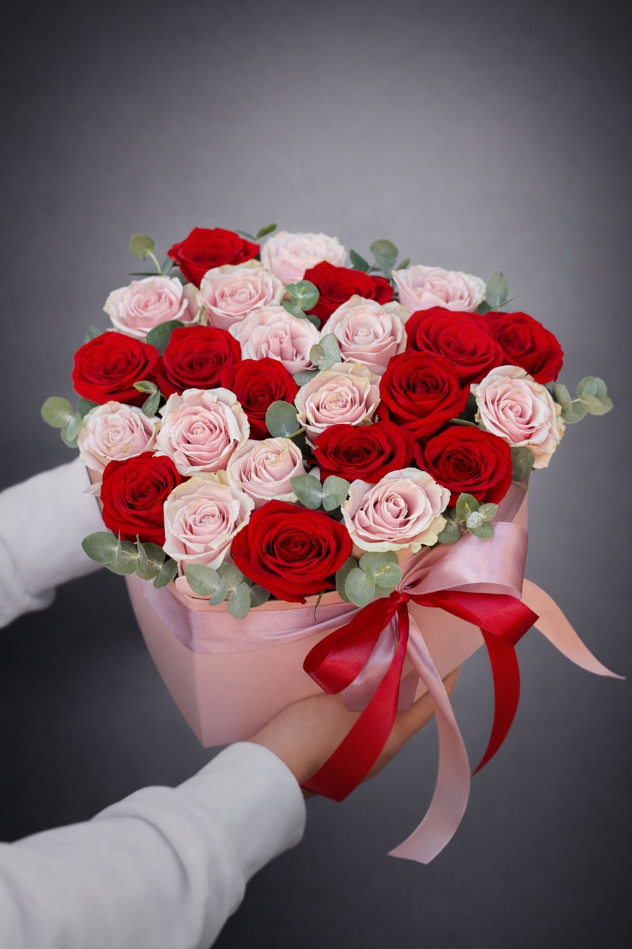 Состав: 25 роз микс, 3 эвкалипт, флористическая губка, коробка, лента