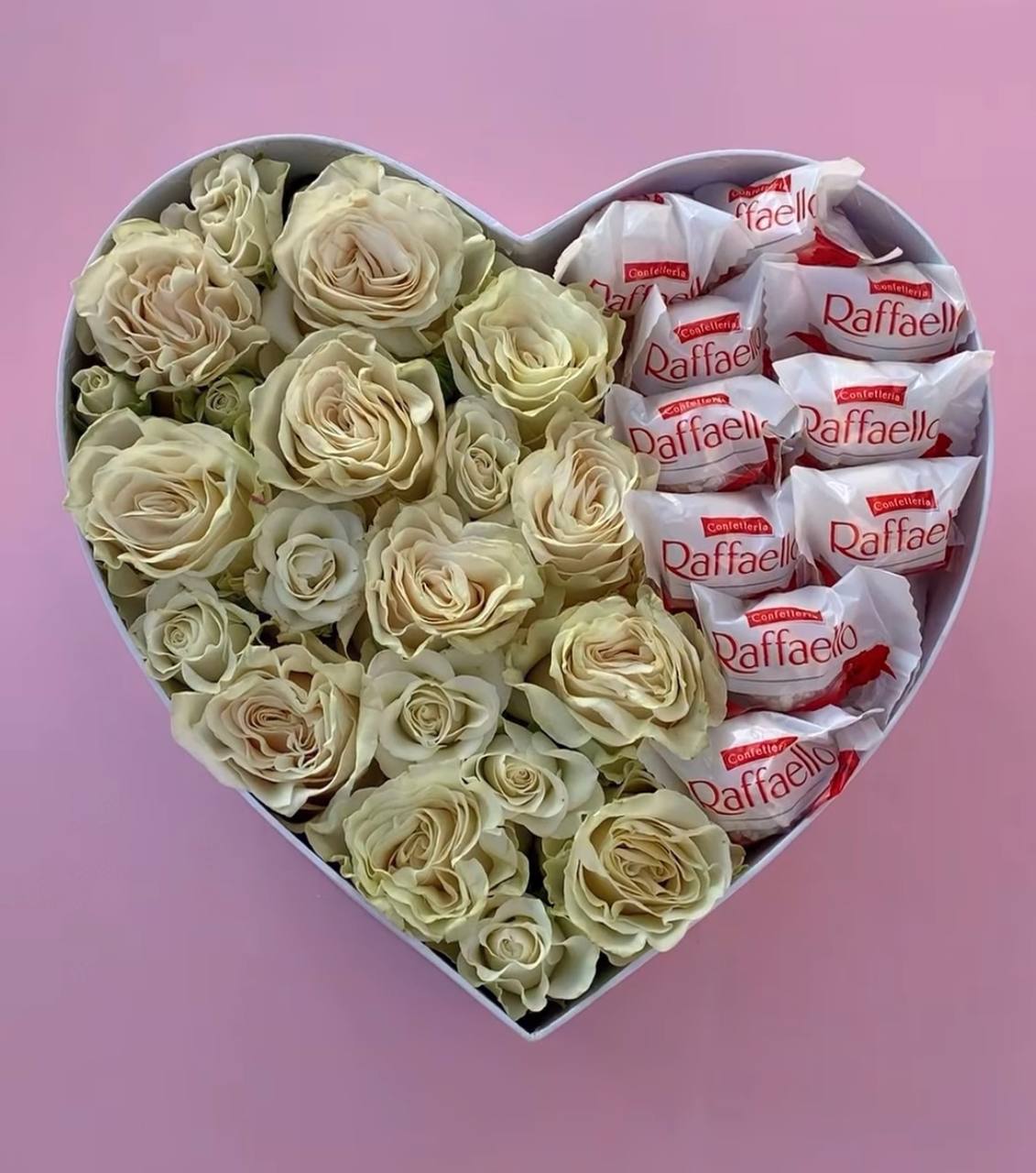 Состав: 11 роз эквадор, 2 кустовые розы, рафаэло, коробка, флористическая губка